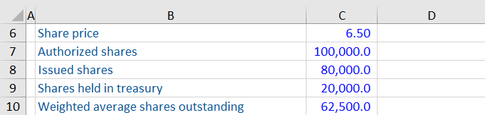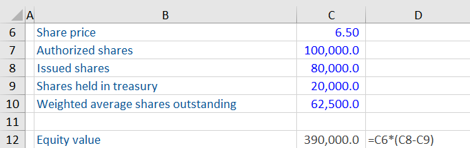 In order to arrive at the equity value or market capitalization of Carne Inc. we need to first calculate the diluted number of shares outstanding. This is done by deducting the shares held in treasury (shares repurchased by the company) from the total number of issued shares.