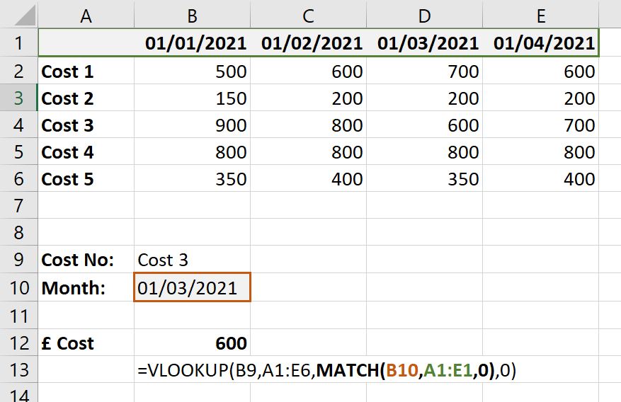 In this simple example the use of MATCH allows both the row to by dynamic, because of the VLOOKUP, and also the column because of the MATCH. A different month can be entered int cell B10 to get the result from a different month. Using this combination of VLOOKUP and MATCH makes the whole data table accessible dynamically.