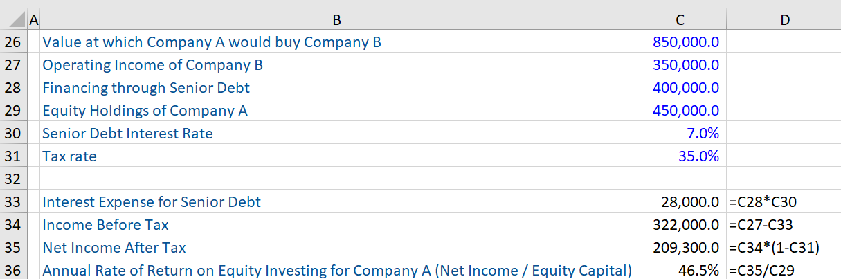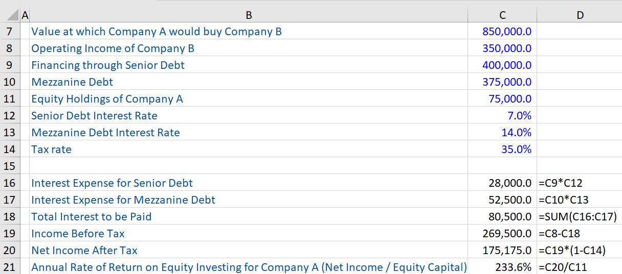 Below are two examples, in the first one, Company A would acquire Company B using mezzanine debt, while in the second example, sans it. This would help understand how mezzanine financing reduces the requirement of equity capital and how it impacts the Return on Equity (ROE) for the borrowing company.