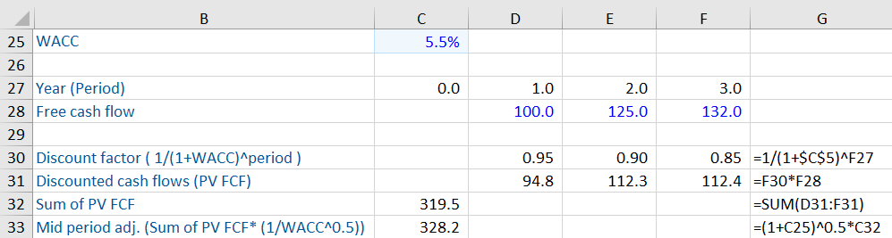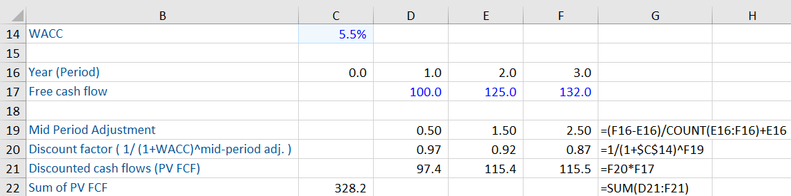 In this second example, we see that the mid period adjustment has been calculated (row 19) and that has resulted in a lower discount factor (row 20) and, therefore, greater sum of the present value of free cash flows (C22).