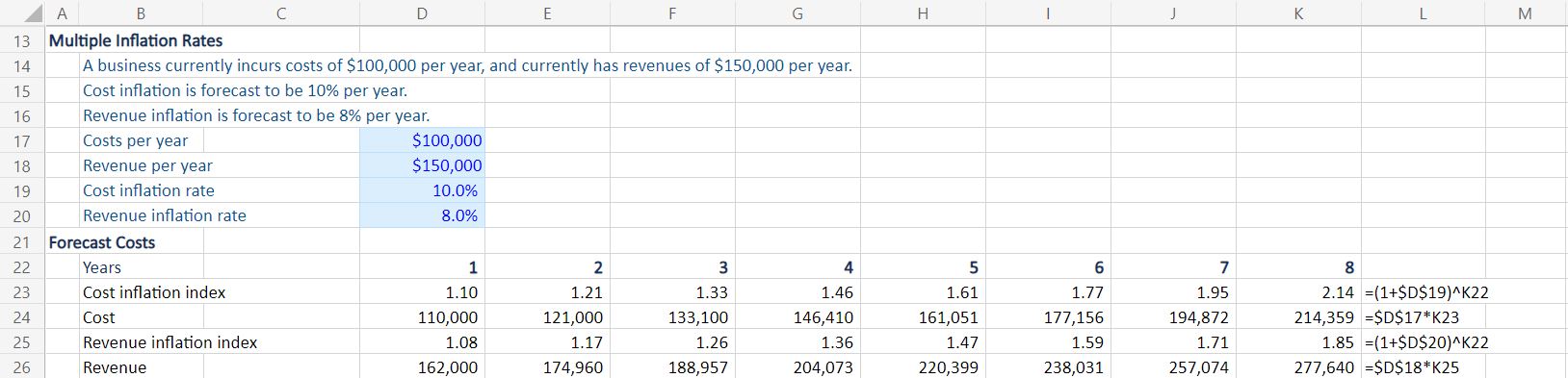Yes, there is no reason for costs and prices to rise at the same rate. If different costs and revenues are inflating at different rates, we can have inputs for different rates and different inflation indexes. Look in the Excel example; it will look like this: