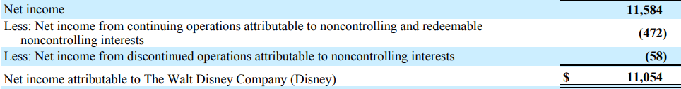 Above, the net income generated for the year is 11,054 but this must be shared between two distinct groups of shareholders. The shareholders of Walt Disney Company are entitled to 11,054 of the total 11,584 with 472 allocated to shareholders who have a non-controlling stake in a subsidiary (or subsidiaries) of the parent company. The proportion of net income attributable to the NCIs is deducted from the group’s accounts and presented separately.