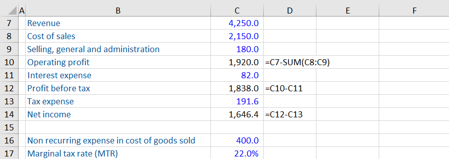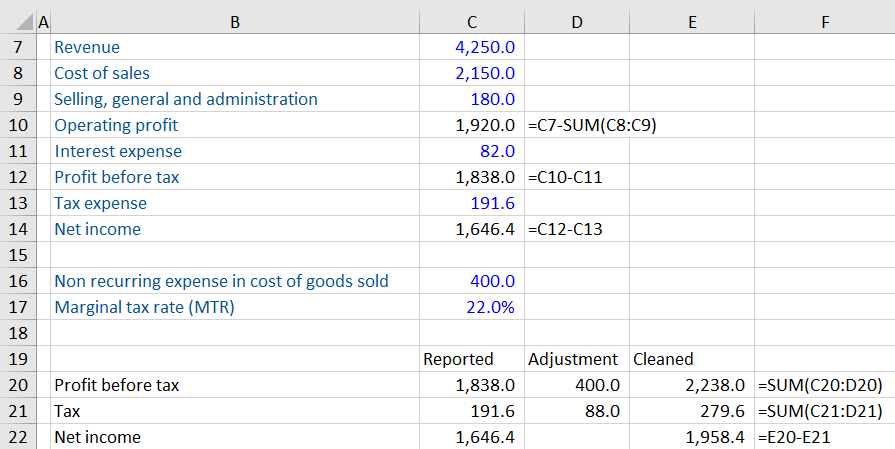 If profit before tax increases, then the tax expense must also increase. The profit has increased and we, therefore, need to apply the marginal tax rate to the amount the profit has increased by. We need to estimate the amount using the marginal tax rate because the post-tax non-recurring expense has not been provided. The adjusted tax amount is 88 (22% * 400) which can now be added to the original tax expense. The normalized net income is the cleaned profit before tax minus the cleaned tax expense, 1,958.4 (2,238 – 279.6).
