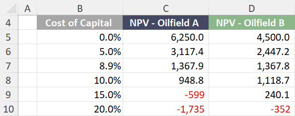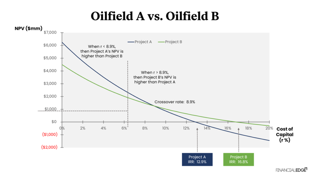 As you can see above, the crossover rate in this scenario is 8.9%. Therefore, if the cost of capital remains below this rate, Oilfield A will yield a higher NPV; otherwise, Oilfield B will surpass Oilfield A in terms of NPV. Below the crossover rate, a conflict arises between NPV and IRR analyses. However, above this rate, both analyses will favor Oilfield B over Oilfield A.