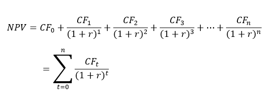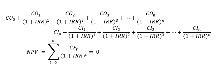 Here, CFt represents the cash flow at time t, while n is project duration, CO denotes cash outflow and CI signifies cash inflow.