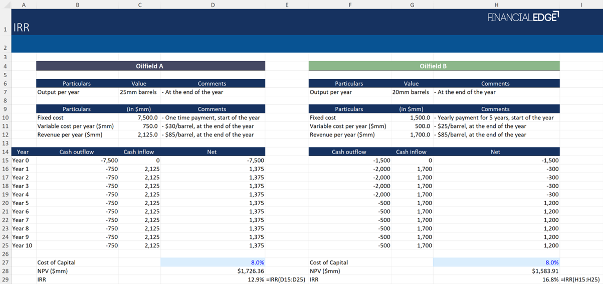 According to IRR analysis, Oilfield B has a higher IRR than Oilfield A, suggesting Oilfield B is the preferred choice. However, NPV analysis indicates Oilfield A is better. So, which one should be chosen? Let’s understand the distinction.