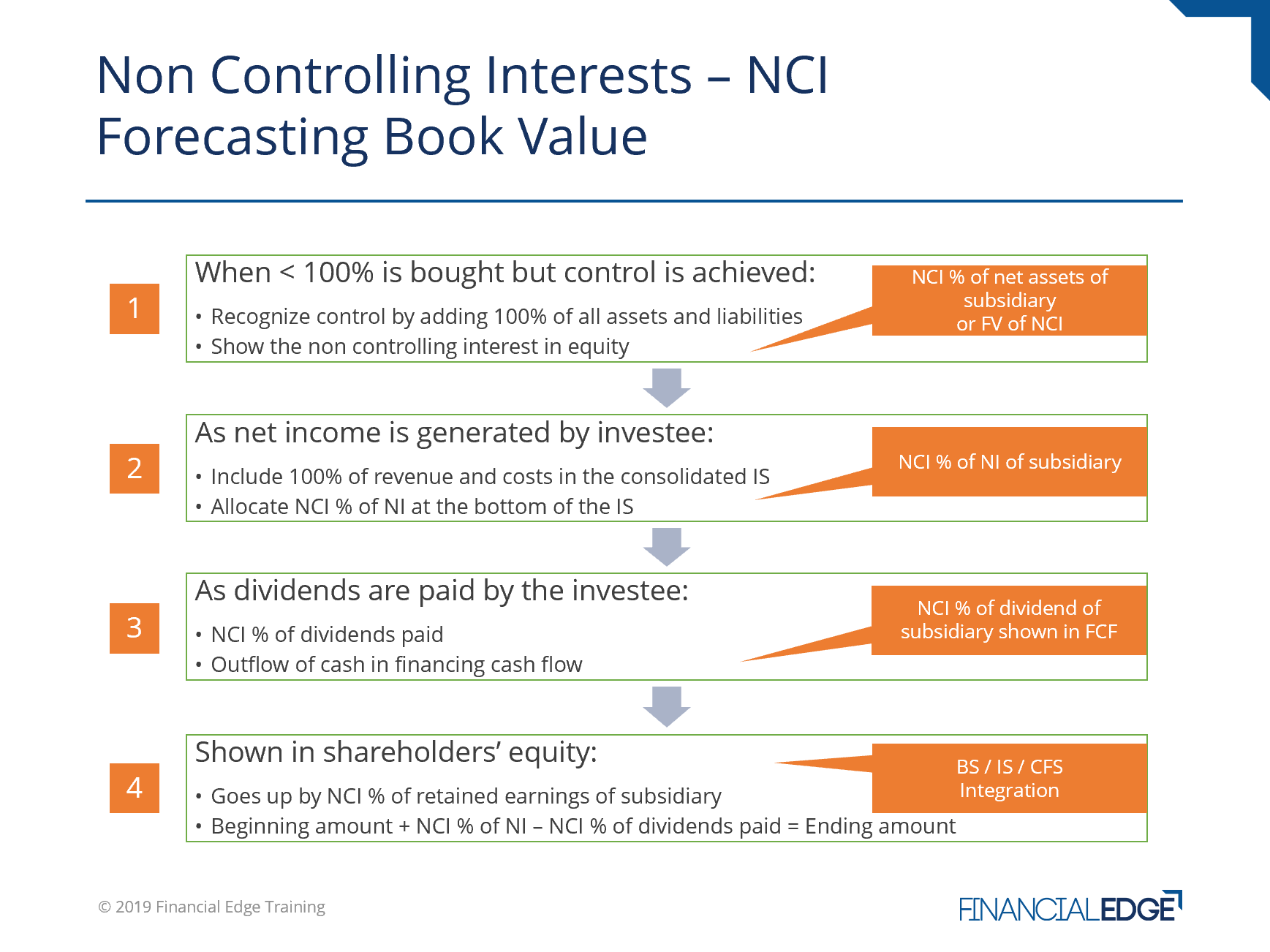 Group accounts are consolidated and this drives the recognition of an NCI. The consolidated balance sheet for a group reflects all assets and liabilities the group controls (say for simplicity’s sake this means to own over 50% of the shares). This results in the balance sheet of the group being partially funded by investors that retain non-controlling stakes. The consolidated balance sheet will have an NCI on the financing side to reflect this.