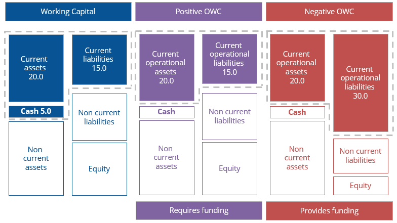 A business with positive OWC, where short-term operating assets are greater than short-term operating liabilities, requires short-term funding. Cash is “tied up” in the company creating the funding requirement. Businesses with negative OWC, where short-term operating liabilities are greater than short-term operating assets, get extra “free funding”.