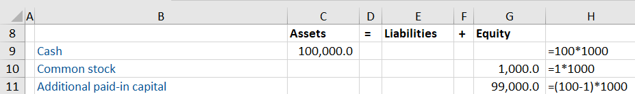 Company A sells 1,000 shares at $100 with a par value of $1.00. Entries in the balance sheet would be as follows: