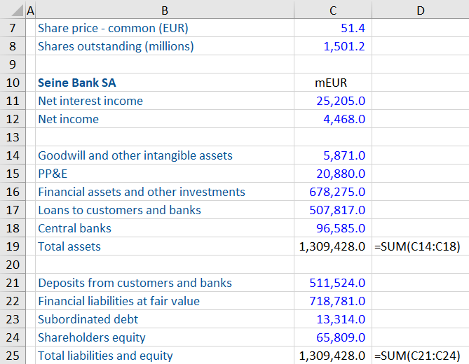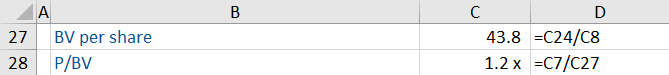 The first step is to identify the relevant information needed for the calculation. As this is a balance sheet, it includes many items which can be ignored. The first sub calculation is to calculate the book value per share. This is calculated as the shareholders’ equity (C24) divided by the share count (C8). This equals 43.8. The company has no dilutive instruments outstanding.