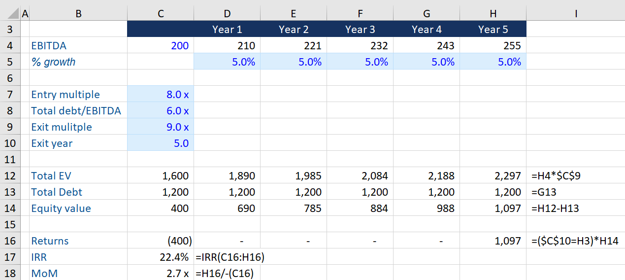 Another common way to measure private equity performance is through the metric “multiple of capital invested” (this is more commonly called “multiple of money” or “cash on cash”). This is simply the ratio of the equity value at sale over the equity value invested, irrespective of time.