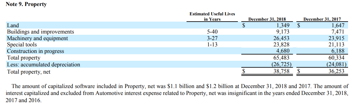 Here we can see how the PP&E is broken down into sub-categories such as land, buildings, and machinery. It also shows construction in progress (i.e., fixed assets or projects being built), which may be part of larger capex programs. General Motors has also provided details of the estimated useful lives, which can then be used for forecasting future PP&E.