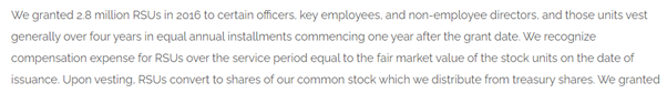 In the above example, Marriott has granted 2.8 million RSUs to certain key officers and employees. The vesting period of these units is 4 years in equal annual installments. The report also mentions how the compensation expense will be recognized in the income statement. It then mentions the conversion of RSUs into common stock upon vesting.