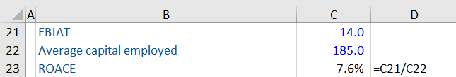 It is calculated as EBIAT/average capital employed. EBIAT stands for earnings before interest after taxes. EBIAT represents the operating income after tax. Interest is not deducted meaning that this measures the businesses profitability ignores its capital structure.
