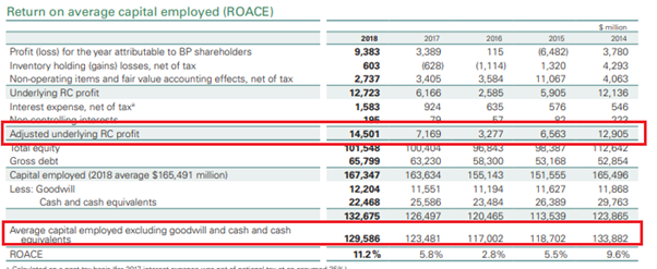 Here the numerator is the adjusted underlying replacement cost (RC) profit of 14,501. This number is calculated by adjusting the net profit (9,383) for non-operating items, interest expense (net of tax), and the amount generated for non-controlling interests. These numbers (excluding the NCI proportion) are added back to the net profit because they are not related to the business’s core operations. This is not true for the NCI adjustment, since this profit has been generated by the operations of the business, but the starting point 9,383 is for BP shareholders only.