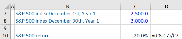 S&P 500 Return (December year 1) = 3,000 – 2,500/ 2,500 * 100 = 20%