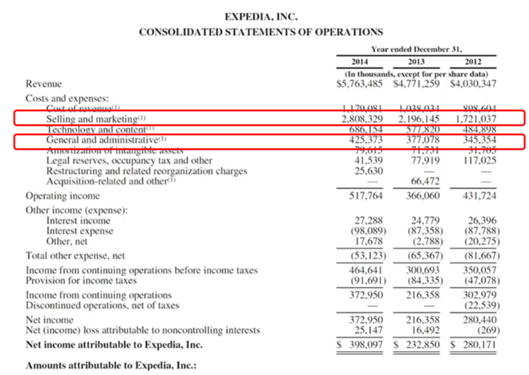 Below is an extract from Expedia’s financial statements. In this case, Expedia has chosen to show the SG&A expenses in two separate line items: