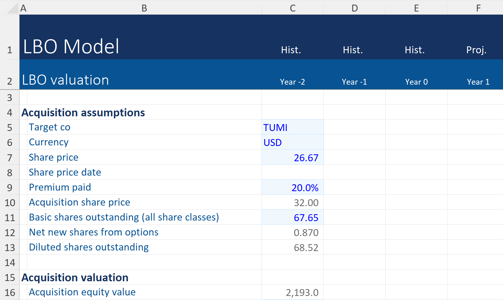 - Download the template and replace the sample inputs with your own valuation assumptions in the designated blue cells.