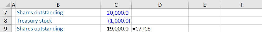 Treasury stock is an account used for representing the number of shares repurchased from the open market. As a result of this buyback, the number of shares outstanding has reduced to 19,000.0.