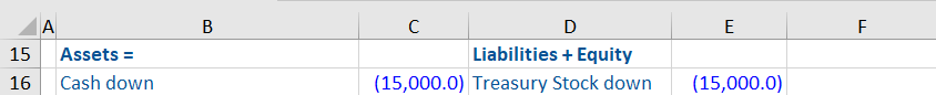 The company must pay cash to buy its own shares, so cash goes down by 15,000.0. The right side of the balance sheet equation is balanced by a reduction in the treasury stock account. Even though the treasury stock account is going up by the repurchase of shares, overall, it has a negative effect on the balance sheet as it reduces the equity.