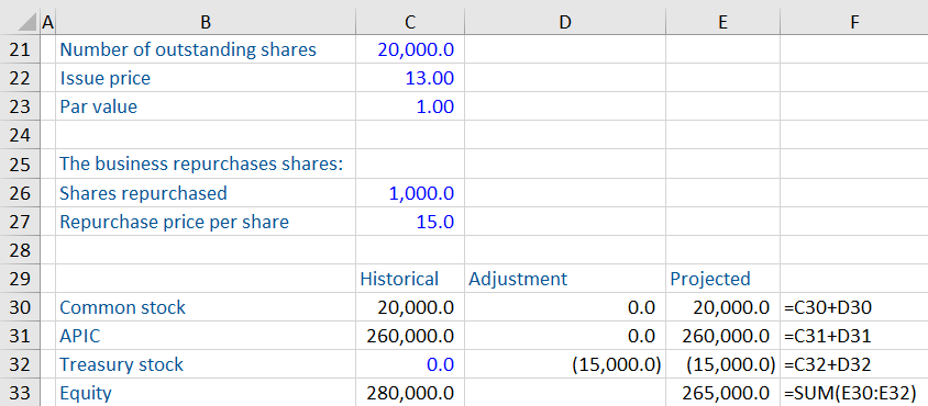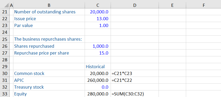 In the example above, the equity of the company is 280,000.0 prior to the share buyback. APIC stands for additional paid-in capital.